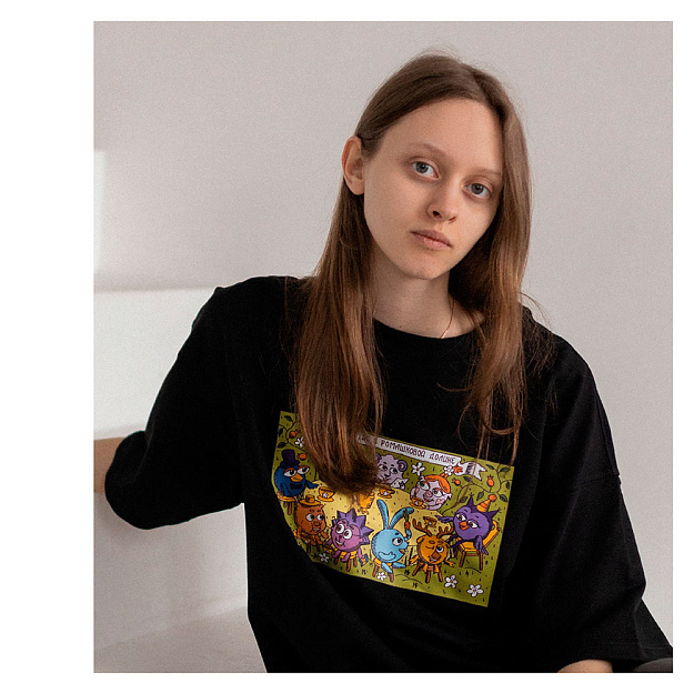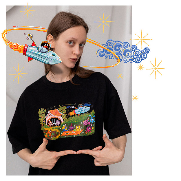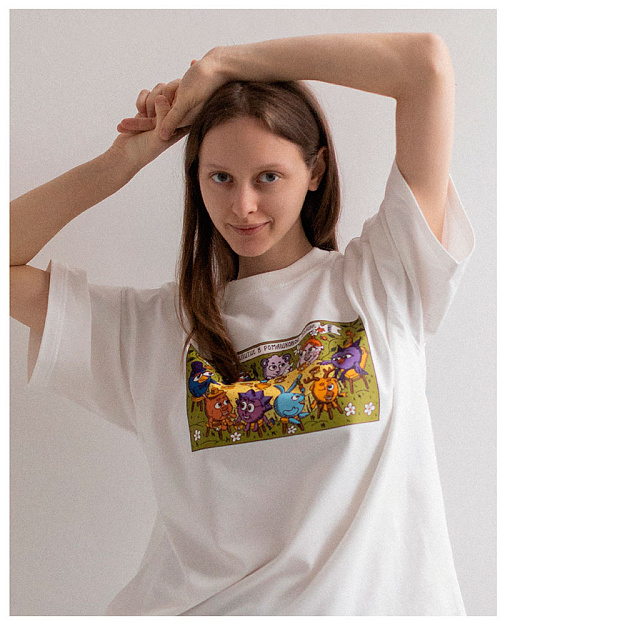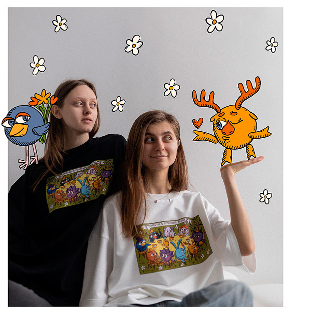 В дроп вошли футболки свободного кроя с двумя авторскими изображениями, вдохновлёнными лубочной графикой и палехской миниатюрой. На принтах изображен повседневный быт жителей Ромашковой долины с отсылками к культовым сериям мультсериала.
