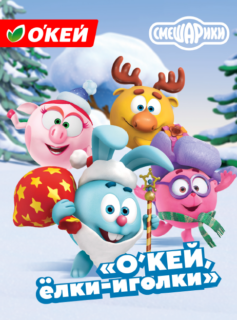 В преддверии новогодних праздников сеть гипермаркетов О’КЕЙ запустила совместную федеральную акцию с мультсериалом «Смешарики». Кампания проходила с 21 ноября 2024 года по 8 января 2025 года и охватила 77 гипермаркетов сети в Москве, Санкт-Петербурге, Новосибирске, Екатеринбурге, Тюмени и других городах России.