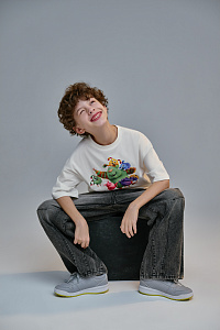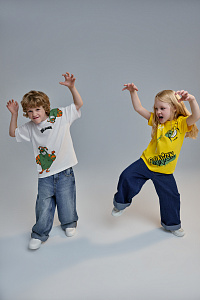 Коллекция выпущена в двух линейках — для мальчиков и девочек. Девочкам предложены футболки трех цветов (серого, розового и молочного оттенков), и черная толстовка, а для мальчиков — футболки черного, белого и желтого цветов, две пары брюк и уютная пижама. Все вещи выполнены из качественного трикотажа и футера.