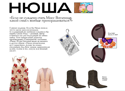 «Нюша романтичная, но с характером. Думаю, её можно стилизовать под бохо: казаки, широкополая шляпа, платье в пол, косуха или вязаный жилет».