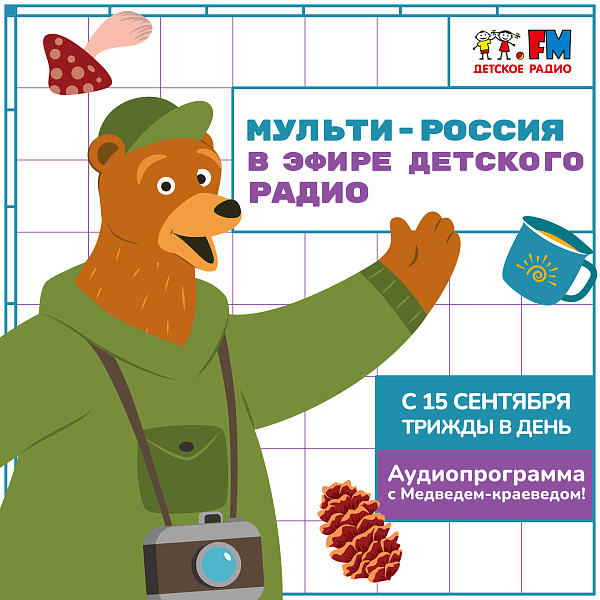 С 15 сентября на Детском радио выходит новая познавательная программа «Мульти-Россия», созданная на основе одноимённого мультсериала ГК «Рики». Каждый выпуск — это увлекательное аудиопутешествие вместе с главным героем проекта, Медведем-краеведом.