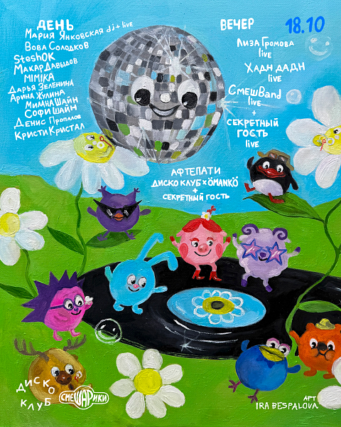 В вечерней программе: артистка Лиза Громова, группы «Хадн дадн» и «СмешBand», а также секретный гость. Завершится фестиваль ночным афтепати* для тех, кто не готов прощаться с ритмом «Смешариков» до утра.